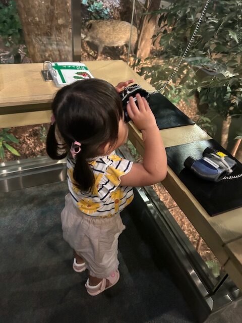 双眼鏡を持って探検隊みたいで可愛い💖奥にイノシシの剥製がいますね🍃