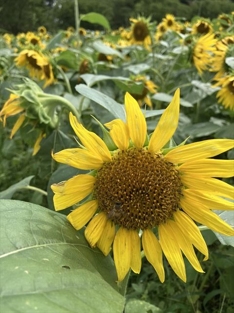 見えにくいですが、ひまわりの左下に、ミツバチがいます!!!